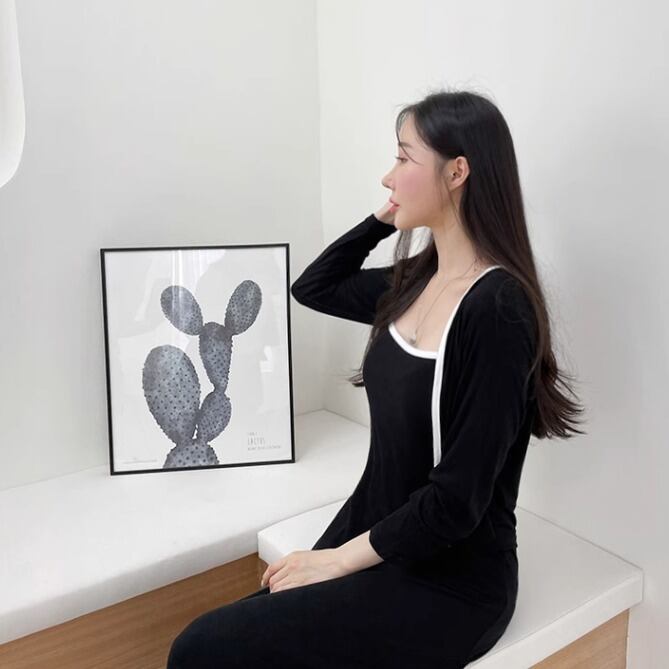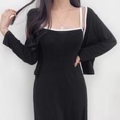 ツーピース レディース ワンピース カーディガン セットアップ 羽織 キャミソールワンピース ミモレ ロング 長袖 キャミソール 襟なし ノーカラー セミフレア Iライン 2way 薄手 ストレッチ 伸縮性 柔らか シンプル カジュアル おしゃれ レトロ こなれ感 ラフ ルーズ 抜け感 キュート ラグジュアリー ナチュラル 休日感 フェミニン 無地 夏 お出かけ リゾート 海 ビーチ 休日 バカンス インドア おうち時間 重ね着 楽ちん 普段使い 着回し 清楚 定番 フリーサイズ ブラック グレー