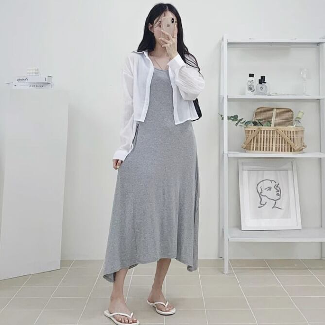 レディース ワンピース ミモレ ロング ノースリーブ タンクトップ Uネック 襟なし ノーカラー セミフレア 薄手 ストレッチ 伸縮性 柔らか シンプル カジュアル おしゃれ レトロ こなれ感 ラフ ルーズ 抜け感 キュート ラグジュアリー カレッジ風 学生風 アクティブ ナチュラル 休日感 フェミニン 活発 無地 夏 お出かけ アウトドア イベント 海 プール ビーチ 公園 休日 カフェ フェス 散歩 インドア おうち時間 韓国 楽ちん 普段使い 着回し トレンド 定番 ゆとり感 ブラック グレー