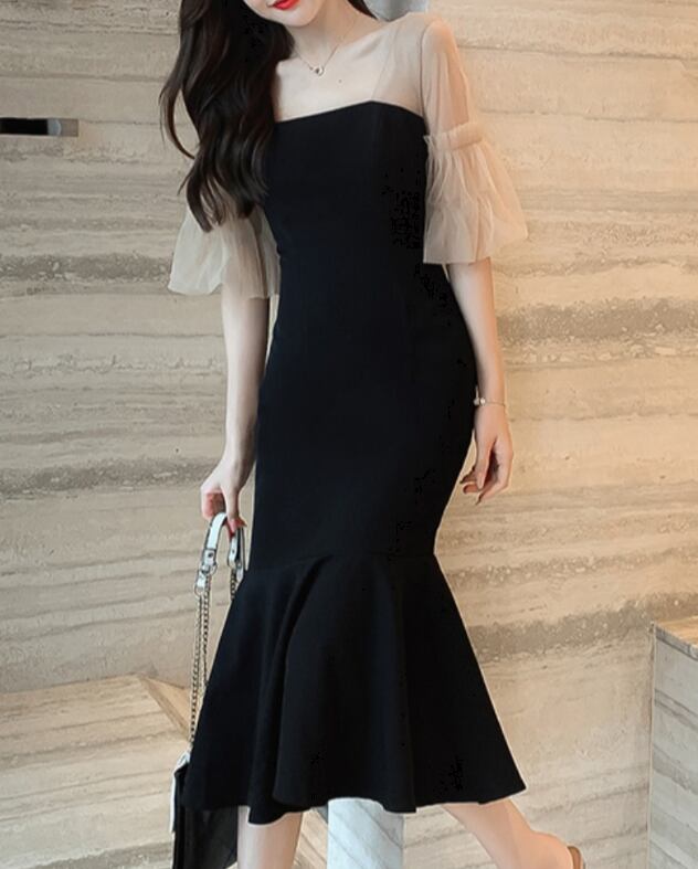 ドレス パーティー 結婚式 二次会 披露宴 演奏会 発表会 ステージ フォーマル 謝恩会 ラウンジ クラブ ミモレ ロング 半袖 フレアスリーブ シアースリーブ スクエアネック マーメイド スレンダー タイト スリム 細身 セミフレア カクテル シフォン フリル 切り替えデザイン 透け感 シースルー 可愛い きれいめ シンプル 大人可愛い 上品 おしゃれ キュート エレガント モダン 存在感 フォーマル 清楚 セクシー シック 華やか フェアリー 無地 韓国 二の腕カバー 高見え シーズンレス フェミニン