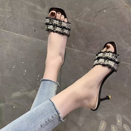 ツイードリボンにパールの装飾が施された、大人可愛いサンダルです♪