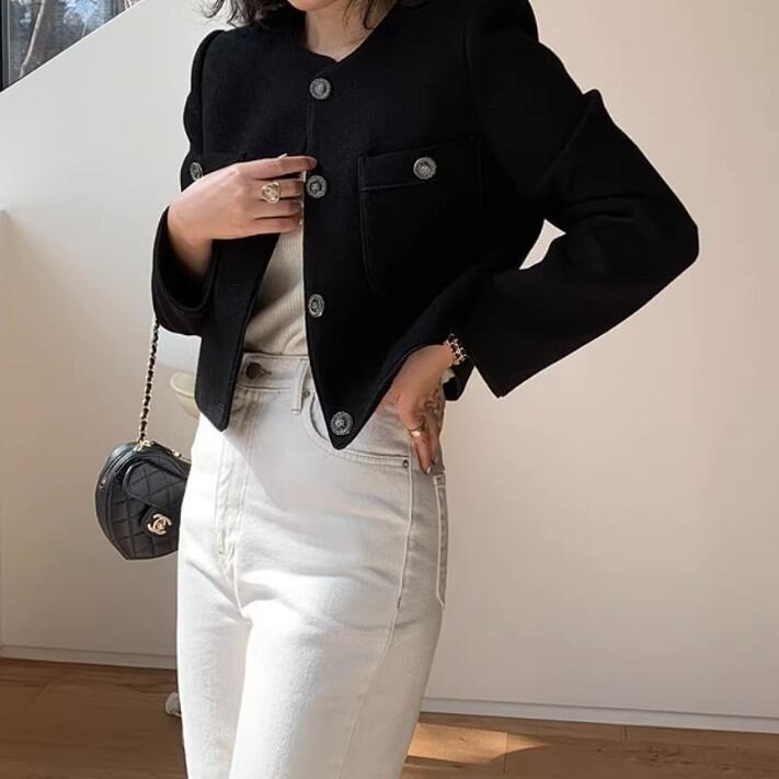 ショート丈でスタイリッシュな印象の洗練されたノーカラージャケットは、シンプルながらも上品さを持ち合わせ、きれいめなスタイルやカジュアルなコーディネートにマッチします。かっこいい雰囲気を漂わせるアイテムでもあるから、マニッシュな印象やクールなスタイリングを叶えます。ドレッシーなスタイルを求める場面にも最適です。