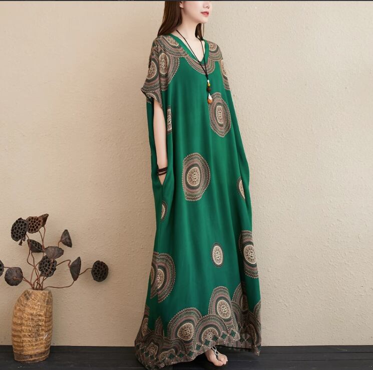 エスニックプリントワンピース ワイドシルエットワンピース 大きめVネック ドルマン袖ワンピース レディース スカート ワンピース プルオーバー オールインワン フレア フレアスカート 膝下 ミモレ ロング 半袖 Vネック ワイド フレア スリム ストレート Iライン スマート シフォン 異国風 かわいい 大人可愛い きれいめ カジュアル 上品 おしゃれ レトロ アジアン エスニック エキゾチック こなれ感 ラフ ガーリー ルーズ 個性的 クール モード系 エレガント モダン 主役級 存在感 春 夏 ママ