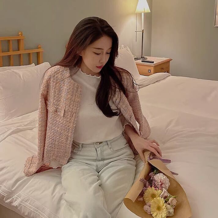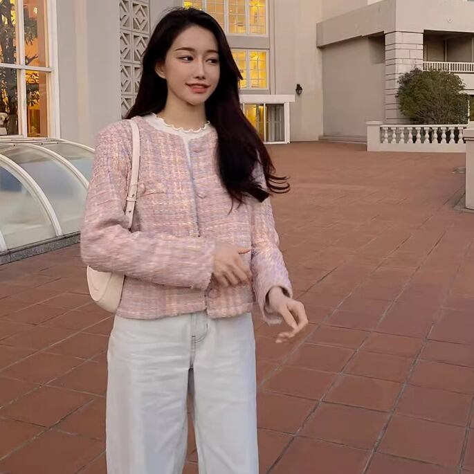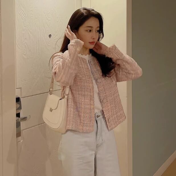 品のある大人の女性にぴったりなツイードチェックのジャケット。シンプルながらもカジュアルから上品まで幅広いスタイリングにマッチし、おしゃれでレトロなこなれ感スタイルをお楽しみ頂けます。エレガントな存在感があり、ハイエンドなファッションやドレッシーコーディネートにもぴったり。淡いピンクが優しい印象をプラスしてくれます。