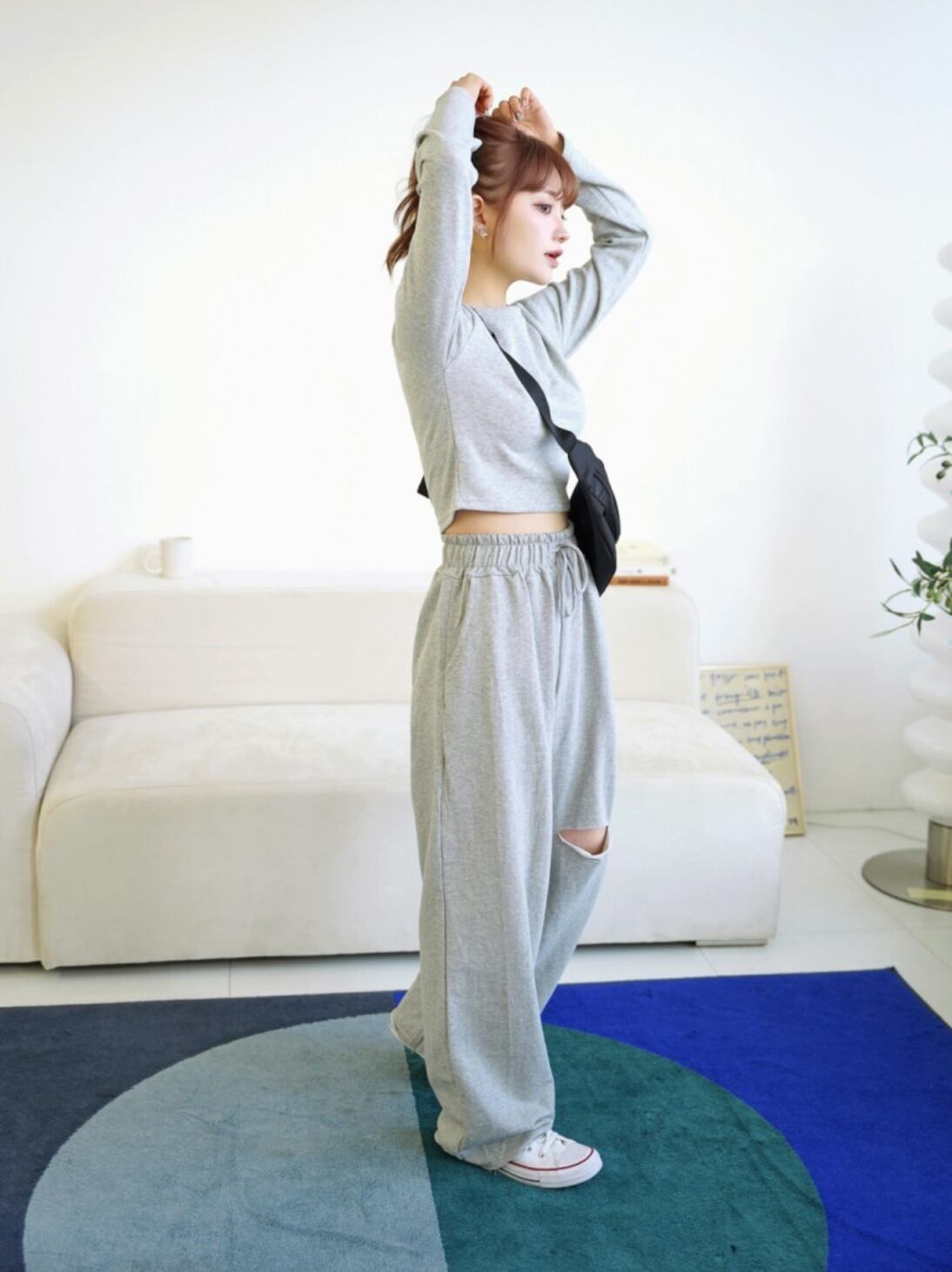 着心地抜群、デイリー使いにピッタリなリラックスセットアップ。短め丈のトップスでやぼったくならず、スッキリと着こなしていただけます。膝に空いたスリットが抜け感とこなれ感を演出してくれ、ワンランクアップのスタイルに!部屋着としても優秀なアイテムです。