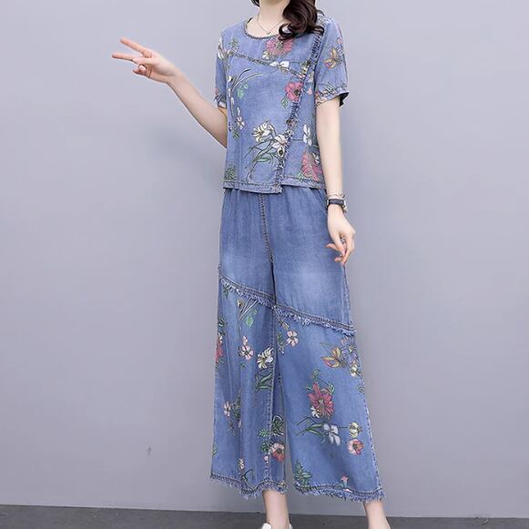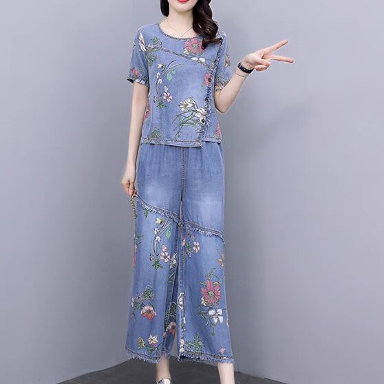 5分袖トップスとセミワイドパンツのセットアイテムです。
