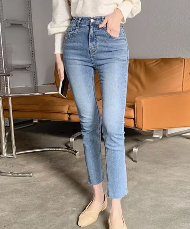 レディース パンツ ボトムス デニム Gパン ストレートパンツ ロングパンツ デニムパンツ ストレッチパンツ ロング 9分丈 クロップド丈 スリム 細身 スリムフィット ファスナー ポケット ハイウエスト 伸縮性 ボタン ヴィンテージ ウォッシュ カットオフ ブルーデニム ストレッチデニム 大人可愛い シンプル カジュアル 上品 おしゃれ こなれ感 ラフ クール 存在感 無地 オールシーズン ロングシーズン シーズンレス デート お出かけ 休日 韓国 オルチャン 美脚 脚長 普段使い モテ トレンド 流行