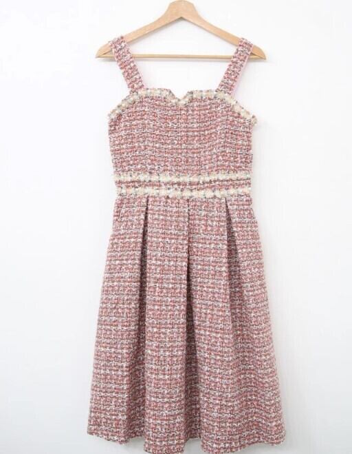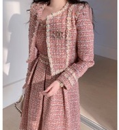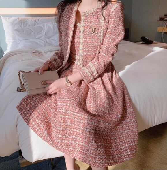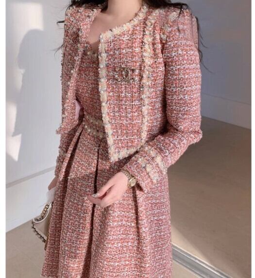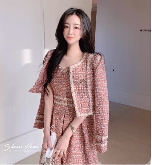 レディースの華やかさを極める、ジャケットとワンピースのセットアップが登場。膝丈のフレアスカートに長袖の襟なしジャケットは、ラメ感のあるツイード素材がキラキラと輝き、かわいさと大人の可愛らしさを引き立てます。ウエストマークで女性らしいシルエットを演出し、前開きデザインがセクシーな魅力を加えます。