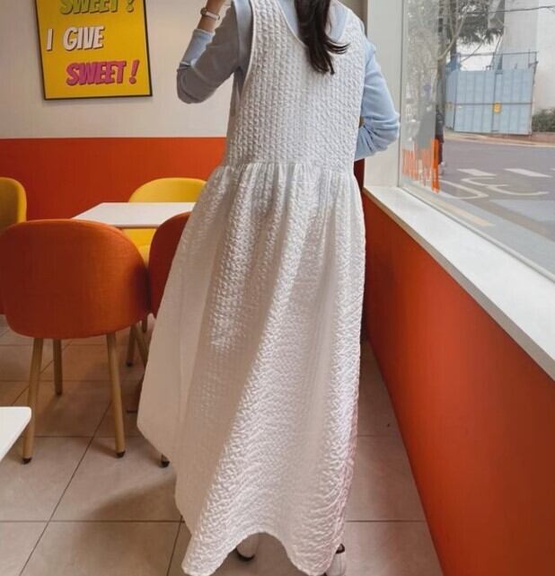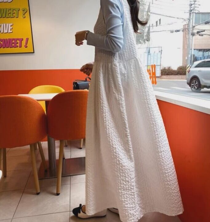 エンボス加工 ワンピース ワンピ プルオーバー フレアワンピース ロング マキシ ノースリーブ ラウンドネック フレア Aライン 立体感 シャーリング ハイウエスト 細見え シワ加工 シンプル カジュアル おしゃれ レトロ こなれ感 ラフ ガーリー 抜け感 ナチュラル やわらかい 着心地 部屋着 ルームウェア フェミニン 無地 万能 ベーシック 春 夏 秋 レディース ママ マタニティ 合わせやすい 着回し 重ね着 楽ちん 体型カバー リラックス レイヤード フリーサイズ ゆったり ゆる 白 ホワイト