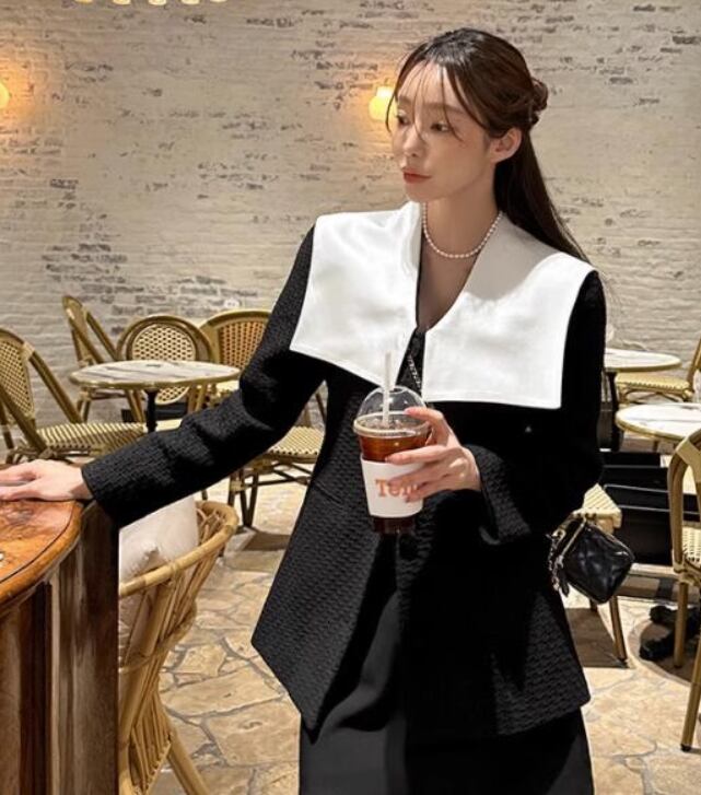 大きな襟で、小顔効果も期待できる一着です。ファッションのアクセントにもなり、様々な場面で着ていただけるアイテムです。