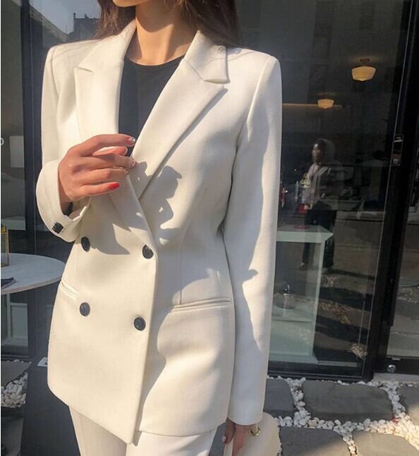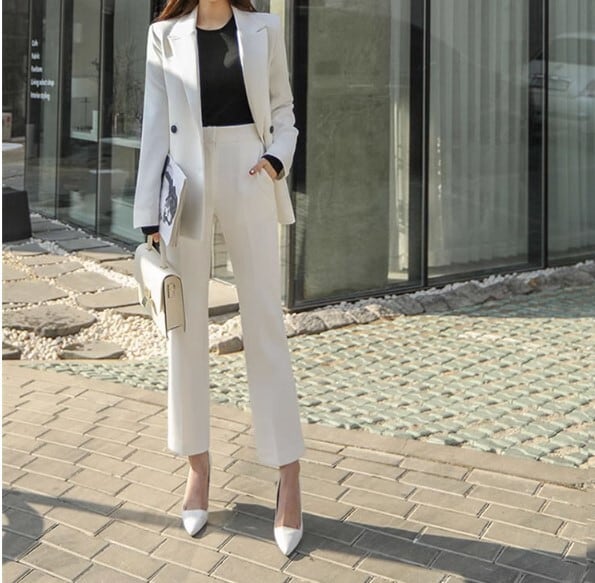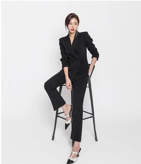都会的なオーラ漂う大人可愛いスーツコレクション。ジャケットとパンツのセットアップで、アンクル丈のタイトなシルエットが魅力です。長袖と襟付きのデザインに角襟のアクセントが加わり、シンプルながらも上品さと存在感を兼ね備えています。クールでモード系のスタイルに加え、エレガントさも漂う主役級のフォーマルスタイリングにもぴったりです。