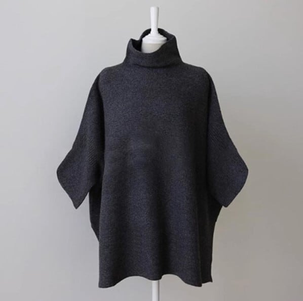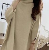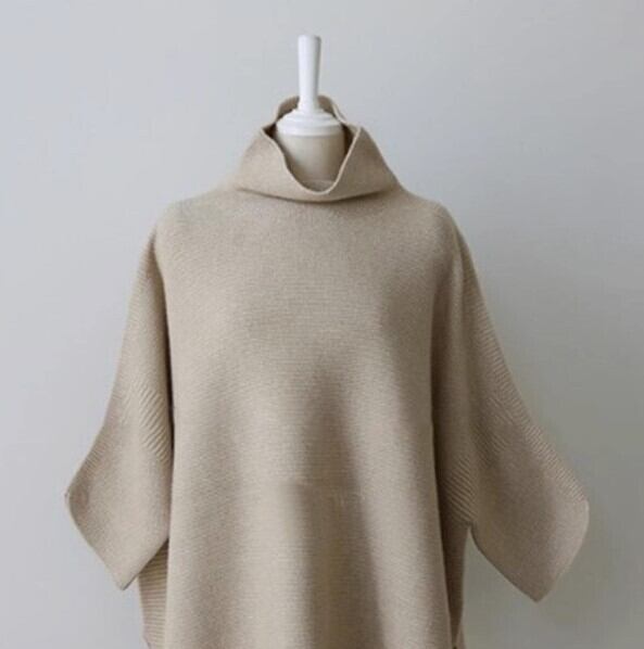 ポンチョ風のレディーストップス。オーバーサイズで、かわいさと大人可愛さを兼ね備えたセーターです。ハイネックデザインが上品でおしゃれな印象を与えます。シンプルながらも個性的でモード系な雰囲気があり、存在感ととろみ感が抜群。都会的でクラシカルなスタイルを演出します。