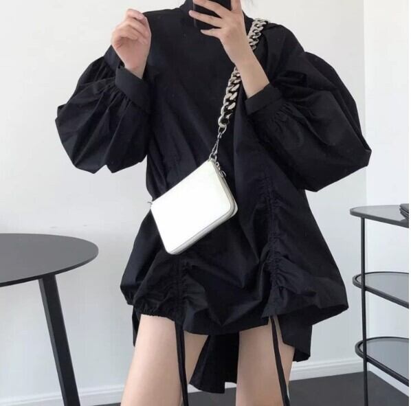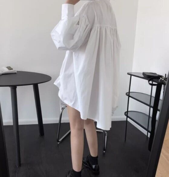 シャーリングデザインが魅力のレディーストップス。シャツやブラウスの要素を取り入れつつ、ロング丈でボリュームのある袖が特徴です。ハイネックとワイドなシルエットが、かわいさと大人可愛さを引き立てます。シンプルながらも個性的でクールなモード系スタイルを演出し、エレガントでモダンな印象を与えます。