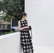 大人可愛いレディースのワンピース。ロング丈の袖なしデザインが上品な印象を与えます。Uネックとフレアのバイカラーがカジュアルでおしゃれな雰囲気を演出。シンプルながらもクールでモード系なスタイルに仕上げました。主役級の存在感ととろみ感、抜け感が都会的で魅力的。ドット柄の水玉が春夏の季節感を引き立てます。誕生日や、学校やデート、お出かけやパーティー、イベントやリゾート、旅行など様々な場面で活躍します。女子会や休日、バカンスやホテルのガーデン、ショッピングや合コン、カフェや婚活にもぴったり。韓国やオルチャンのトレンドを取り入れたコーディネートで体型カバーと美脚効果、脚長効果も叶えます。