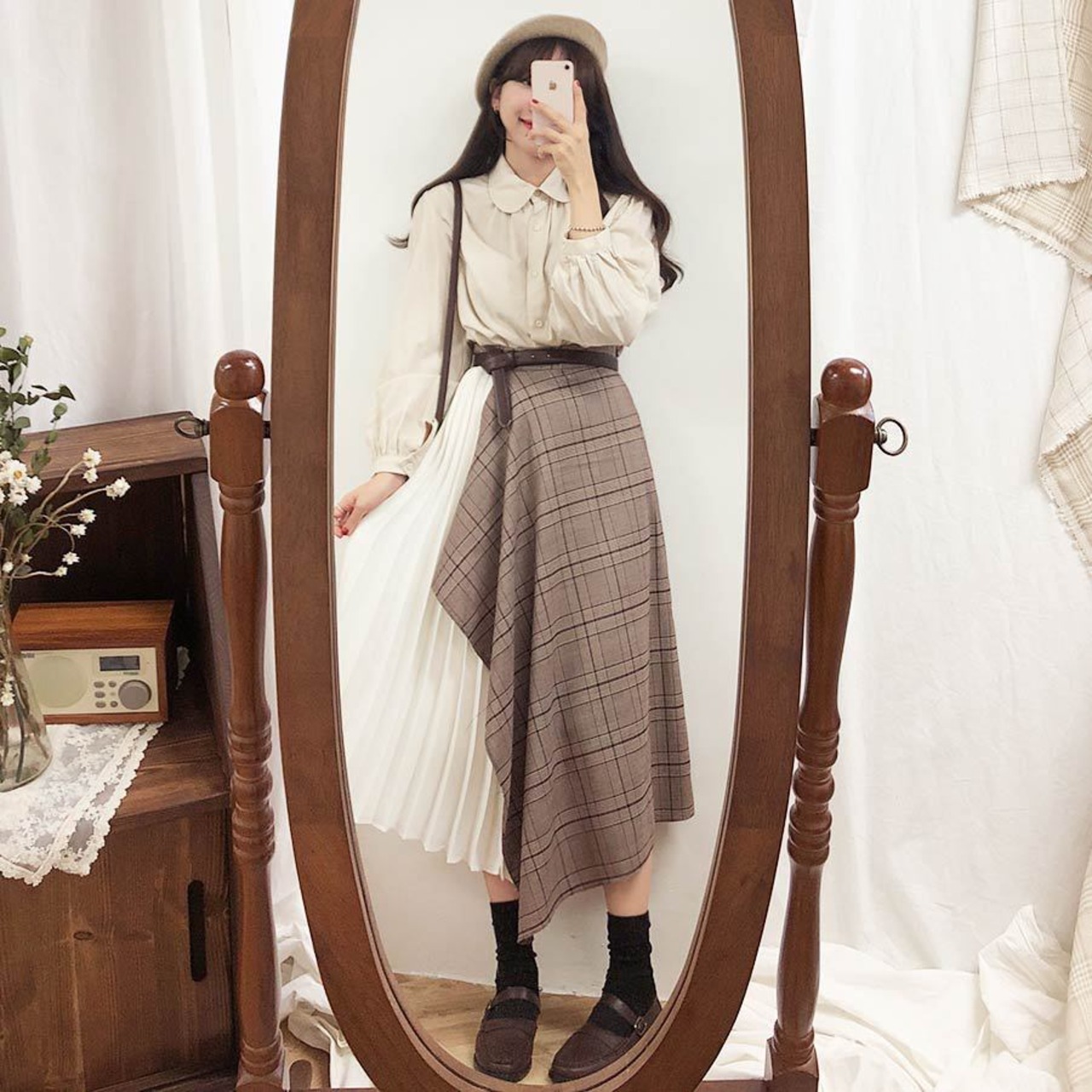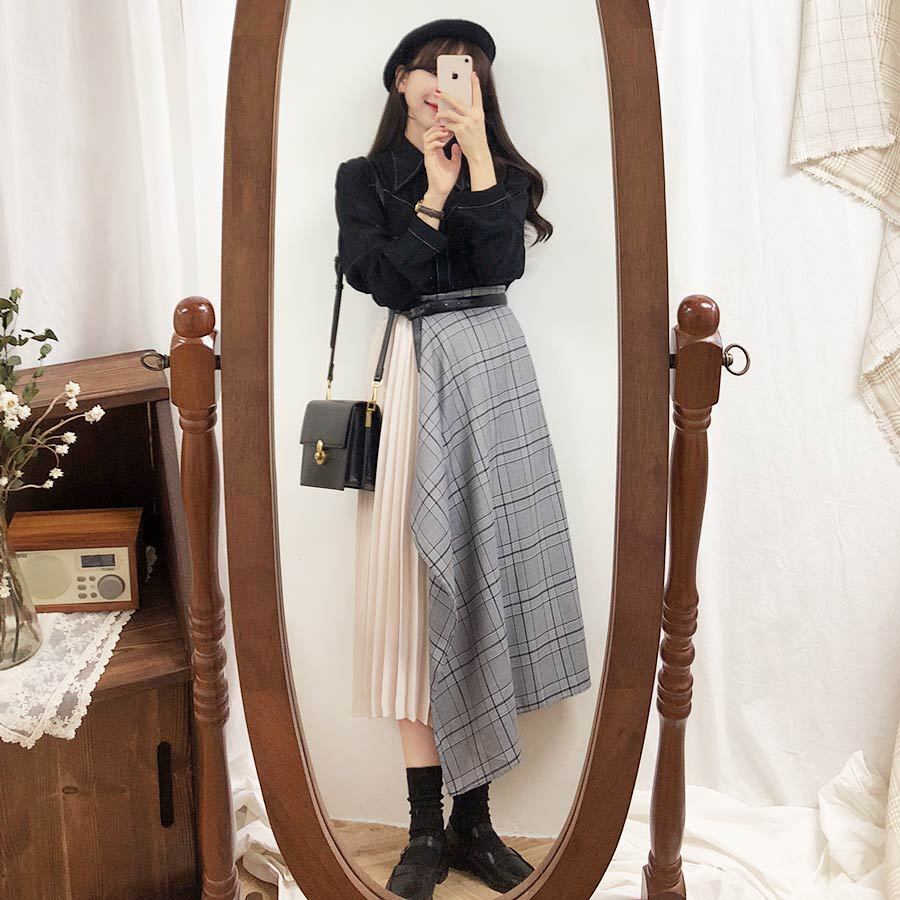スカートは膝下丈で、プリーツが施されており、チェック柄のスカートがドッキングされていてアシンメトリーなデザインです☆