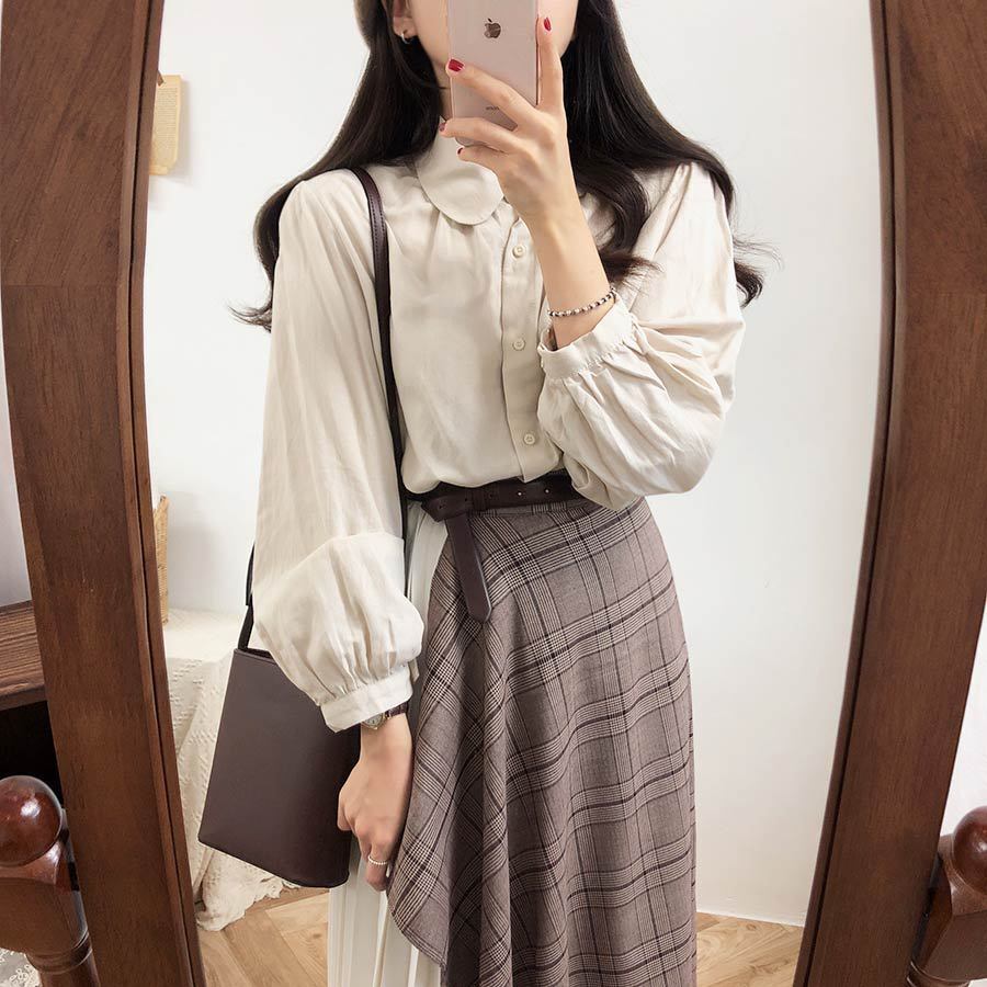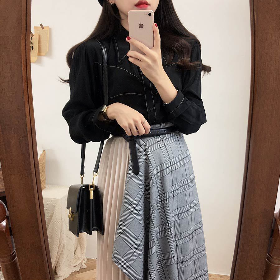 シャツはバイカラーのステッチが効いたデザインで、スカートを引き立てる着回ししやすいシンプルデザインです☆