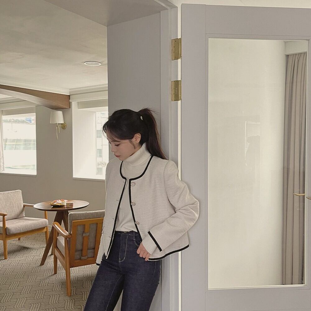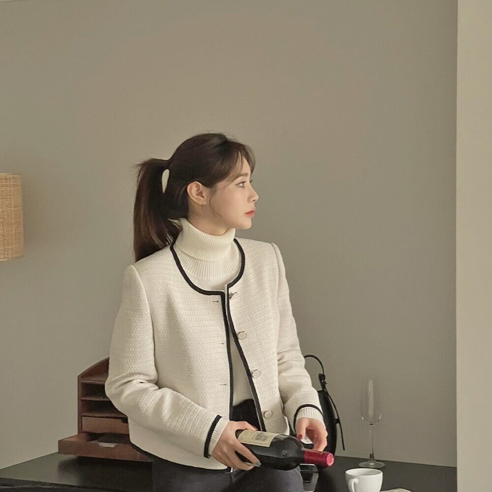 上品でキュートなセットアップ!ノーカラージャケットとショートスカートのセットは、大人可愛いスタイルを演出してくれます。シンプルなデザインでありながら、ポケットやボタンなどのディテールがアクセントになっています。