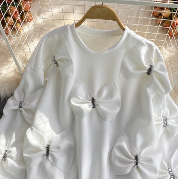 レディース トップス スウェット 長袖 ボリューム袖 Uネック リボン ビジュー かわいい 大人可愛い きれいめ シンプル カジュアル おしゃれ かっこいい 個性的 モード系 モダン 主役級 存在感 とろみ感 抜け感 キュート ラグジュアリー 無地 春 秋 冬 ロングシーズン クリスマス バレンタイン OL 通勤 学生 学校 通学 デート お出かけ お泊まり イベント 旅行 女子会 休日 就活 ホテル ガーデン ショッピング 発表会 コンサート ライブ コスプレ 合コン コンパ カフェ 体型カバー モテ