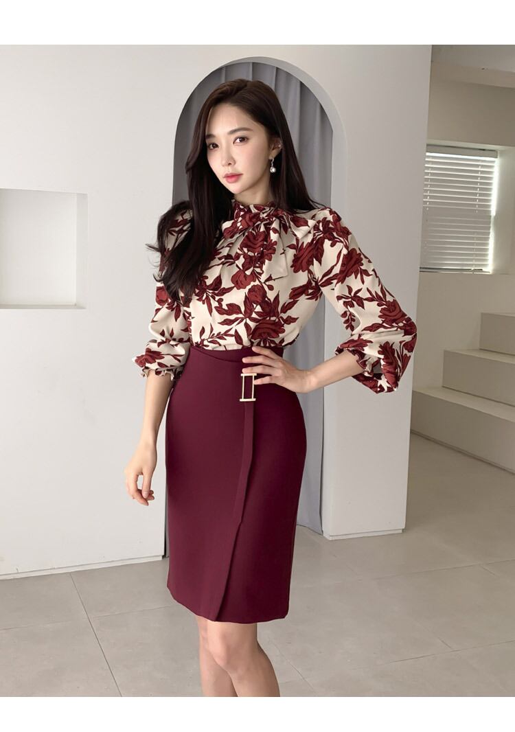 レディース スカート トップス ブラウス スーツ セットアップ ツーピーススーツ ドレスシャツ タイトスカート 膝丈 長袖 ボリューム袖 フレアスリーブ フリル袖 スタンドカラー りぼんタイ フェミニン ウエストマーク 薄手 大人可愛い きれいめ シンプル 上品 こなれ感 クール モード系 エレガント 都会的 ロマンティック 花柄 オールシーズン 結婚式 二次会 披露宴 発表会 通勤 デート パーティー レストラン ホテル ショッピング 楽ちん 体型カバー 普段使い 着回し S M L XL ワインレッド