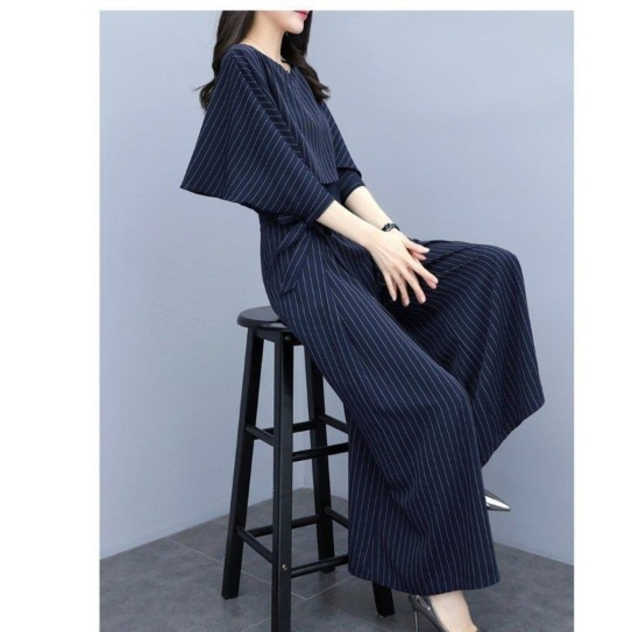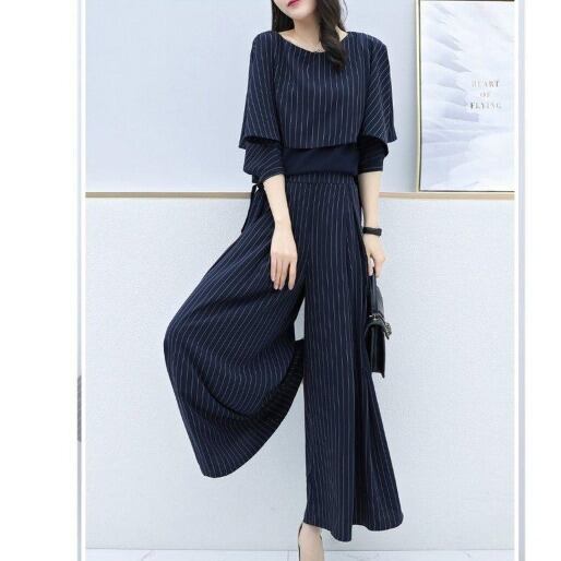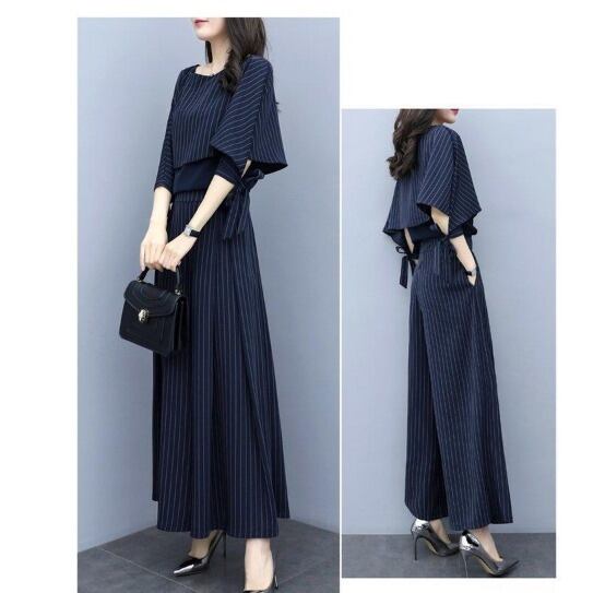 ツーピース レディース パンツ カットソー セットアップ ガウチョパンツ ロング フルレングス 5分袖 ボートネック 襟なし ノーカラー ワイド Aライン オーバーサイズ 変形 シフォン リボン ハイウエスト コンサバ 切り替えデザイン 異素材ミックス きれいめ カジュアル 上品 おしゃれ レトロ こなれ感 ラフ ルーズ 個性的 フォーマル 抜け感 都会的 ラグジュアリー ハイエンド 大人女子 ストライプ 春 夏 会議 オフィス ビジネス OL 通勤 パーティー 婚活 楽ちん 体型カバー 清楚 ネイビー