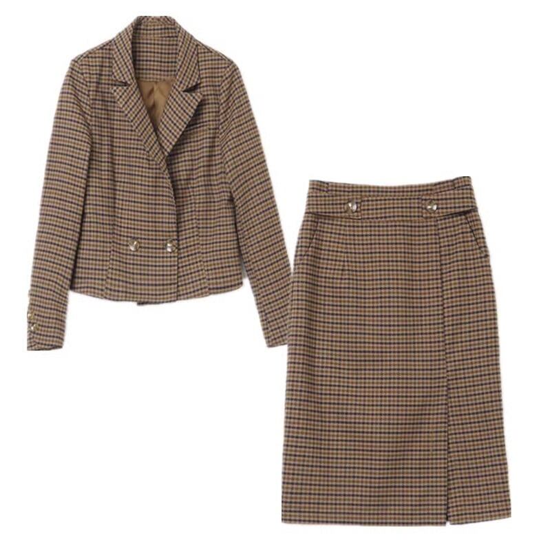 ツーピース レディース スカート ジャケット スーツ アンサンブル 上着 膝下 長袖 カフスボタン 襟付き Iライン ポケット ハイウエスト コンサバ ボタン 裏地付き きれいめ カジュアル 上品 おしゃれ かっこいい レトロ こなれ感 マニッシュ 存在感 フォーマル 抜け感 都会的 ラグジュアリー ハイエンド ドレッシー チェック 春 秋 会議 オフィス ビジネス OL 通勤 パーティー レストラン ホテル 婚活 お呼ばれ 重ね着 普段使い 着回し トレンド M L XL 2XL ブラウン ベージュ
