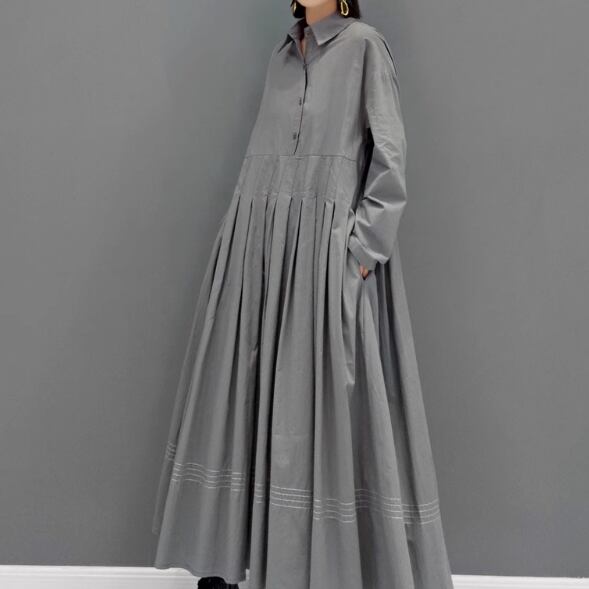 レディース ワンピース シャツワンピ 膝下 ロング 長袖 襟付き フレア プリーツ かわいい 大人可愛い シンプル カジュアル おしゃれ かっこいい レトロ アジアン ラフ 存在感 アメリカン カントリー アクティブ ナチュラル カジュアルコーデ 無地 ライン 春 秋 ママ 20代 30代 デート お出かけ お泊まり アウトドア キャンプ リゾート 旅行 公園 女子会 休日 バカンス ショッピング お花見 カフェ ママ会 コーデ 楽ちん 美脚 脚長 トレンド インスタ映え フリーサイズ グレー