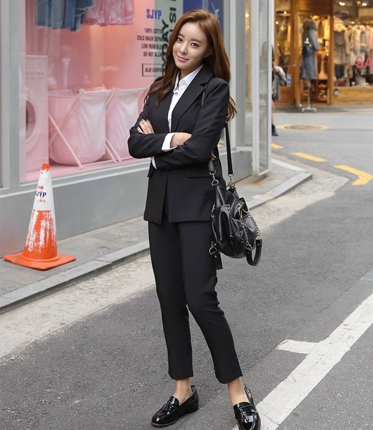 こちらのレディーススーツは、テーラードジャケットとテーパードパンツのセットアップです!