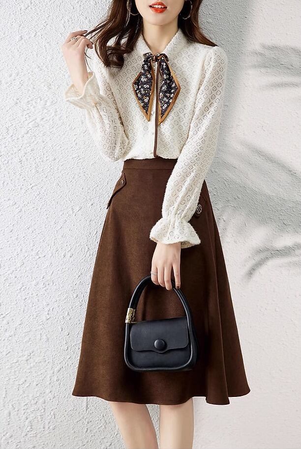 ツーピース レディース シャツ ブラウス セットアップ 膝下 長袖 パフスリーブ フリル袖 襟付き スカーフ セミフレア Aライン レース フリル 前開き 透け感 コンサバ ボタン 異素材ミックス 柔らか きれいめ シンプル カジュアル 上品 おしゃれ レトロ こなれ感 ガーリー 個性的 モダン フォーマル キュート 都会的 ラグジュアリー ロマンティック ナチュラル ハイエンド ドレッシー フェミニン 大人女子 控えめ 春 秋 会議 オフィス ビジネス お呼ばれ 普段使い コーデ ホワイト ブラウン