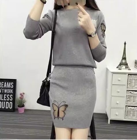 ラウンドネックの長袖セーターとニットスカートのセットです♪