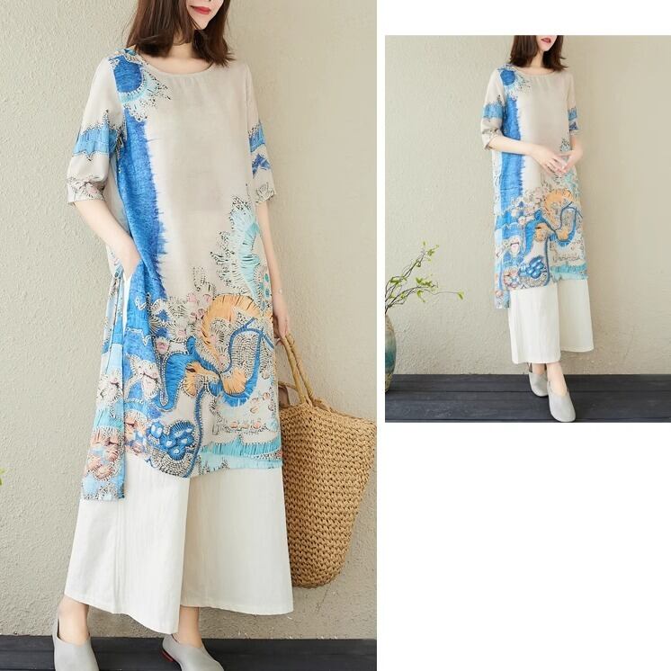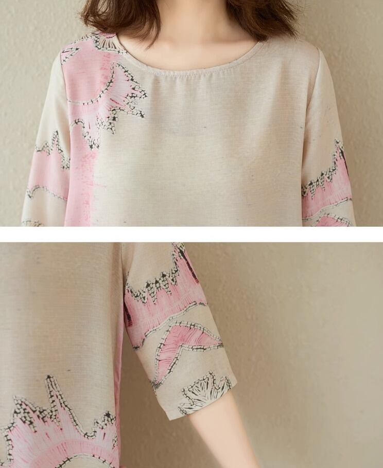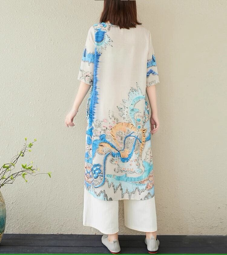 ツーピース セットアップ レディース パンツ ロンT ロングパンツ ワイドパンツ ロング 5分袖 ラウンドネック 襟付き ノーカラー ワイド ストレート オーバーサイズ リボン サイドスリット ポケット 異国風 バイカラー 配色 薄手 柔らか さらさら カジュアル おしゃれ レトロ エスニック こなれ感 ラフ ルーズ 個性的 主役級 存在感 抜け感 休日感 ユニーク プリント 夏 お出かけ リゾート 休日 バカンス 楽ちん 体型カバー 普段使い 着回し インスタ映え ゆったり ピンク ブルー グリーン