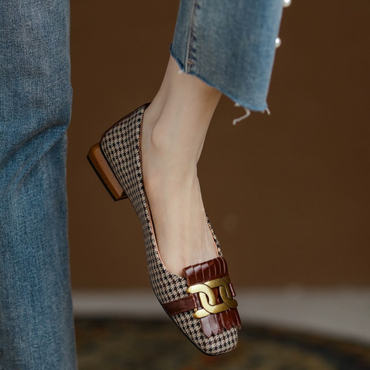 千鳥格子 スクエアトゥ レディース パンプス フラットシューズ 太ヒール フラット ぺたんこ タッセル かわいい 大人可愛い きれいめ 上品 おしゃれ レトロ エレガント モダン 存在感 フェミニン 千鳥格子 謝恩会 二次会 オールシーズン オフィス OL 通勤 デート お出かけ イベント リゾート 旅行 海外 ホテル 休日 デイリー 普段使い コーデ スタイル 高見え モテ 22.5cm 23.0cm 23.5cm 24.0cm 24.5cm 25.0cm 25.5cm 26.0cm 茶色 ブラウン