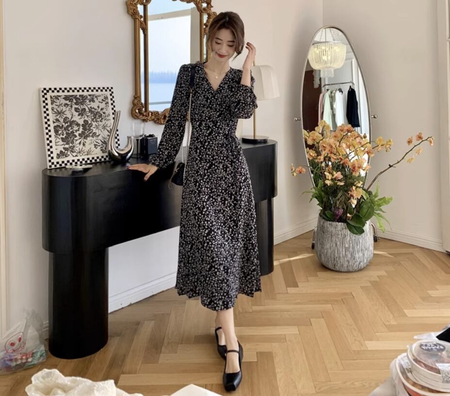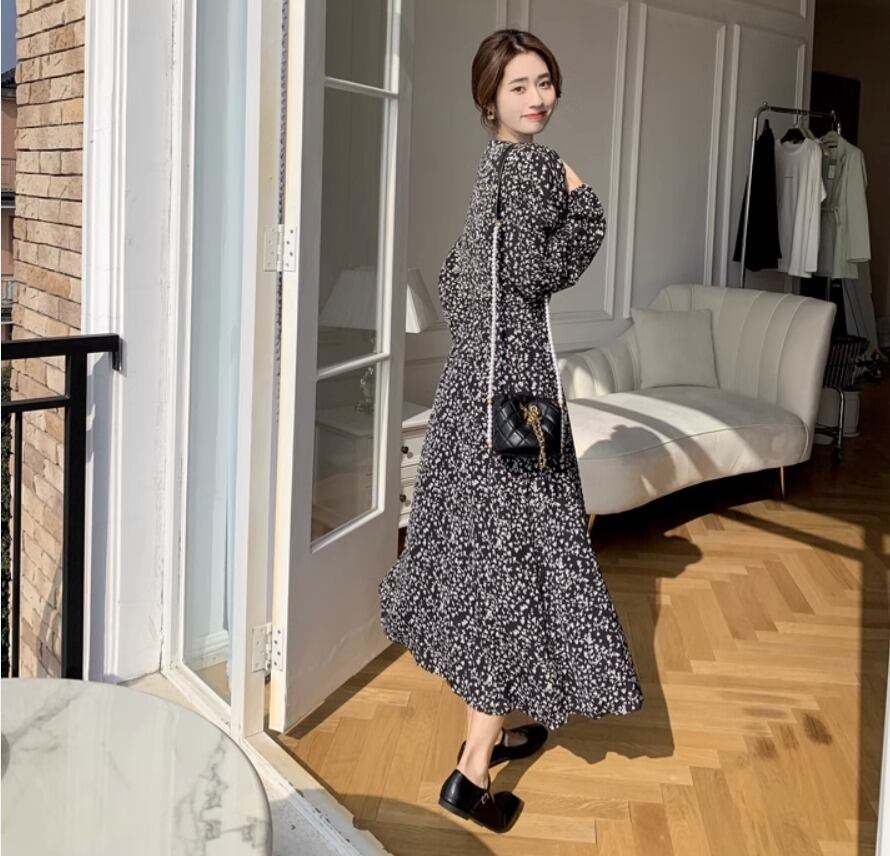 ワンピース デート フレアワンピース ワンピドレス ミモレ ミモレ丈 袖あり 長袖 ボリューム袖 フレア 切り替えデザイン フリル リボン ウエストマーク ウエストリボン かわいい 大人可愛い シンプル カジュアル おしゃれ お洒落 かっこいい 大人可愛い 大人女子 こなれ感 存在感 抜け感 柄 花柄 小花柄 フラワー 春 秋 冬 誕生日 10代 20代 30代 レディース ママ OL デート お出かけ 旅行 ホテル ガーデン レストラン ショッピング ファッション コーデ スタイル XS S L