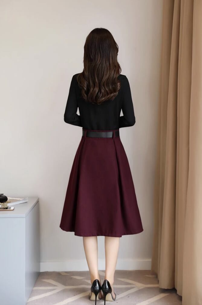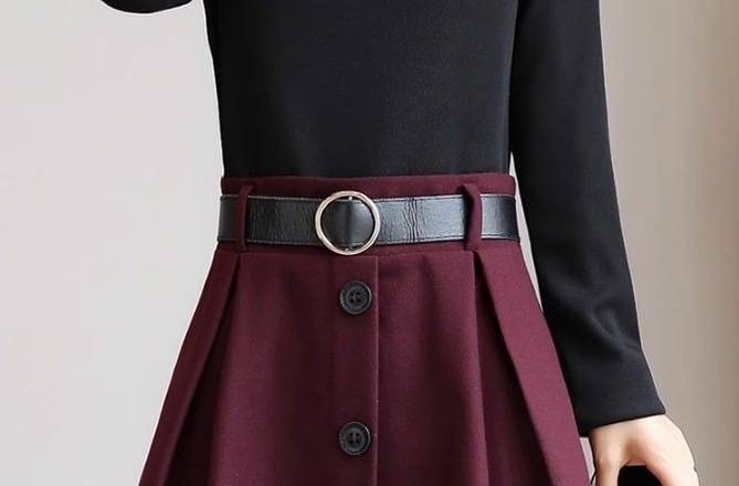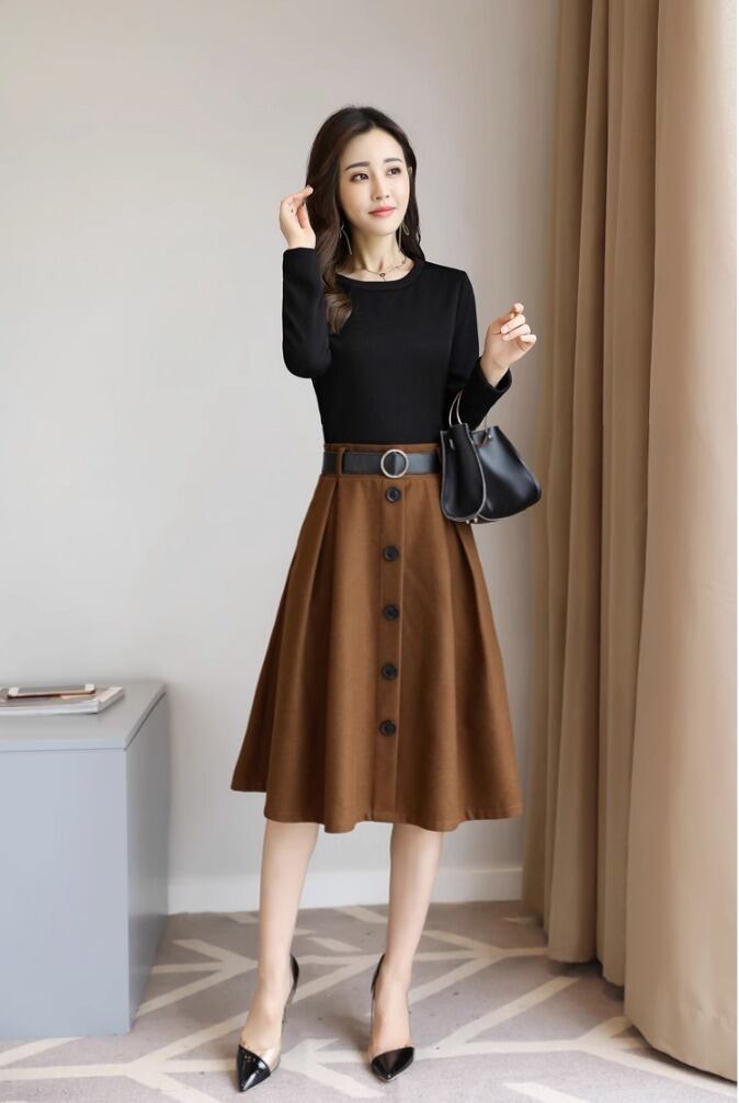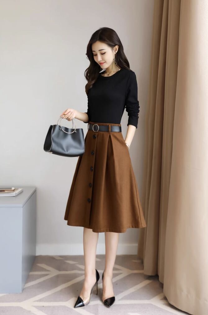 前ボタンのスカートにはベルトが付いており、トップスは長袖のラウンドネックです。