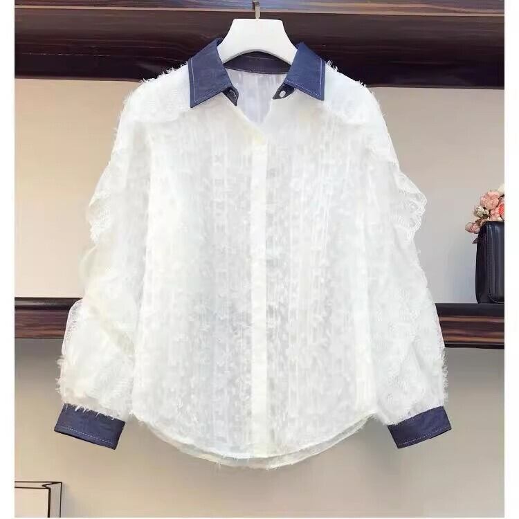 シンプルで上品なデザインながら、カジュアルな印象を演出してくれる長袖シャツ。透け感のあるシフォン素材にレースのような総デザインが華やか。襟元とカフスにデニム地を使用することで程よい抜け感を演出でき、ゆとり感のあるシルエットは体型カバーにも◎ 清楚な印象のホワイトカラーが洗練されたスタイリングを引き立たせてくれます。