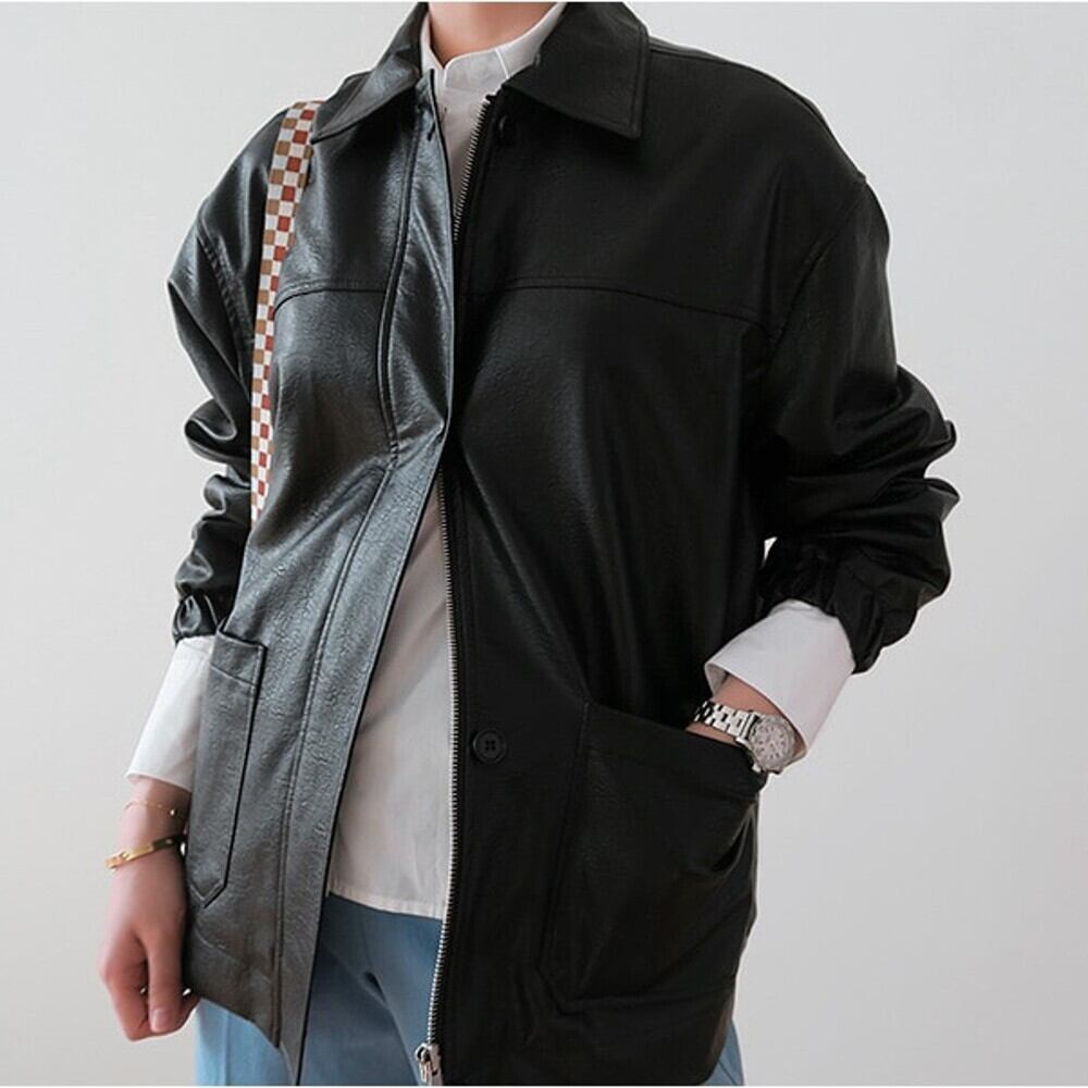 レディース ジャケット アウター 上着 レザージャケット 長袖 ストレート ファスナー ポケット ボタン フェイクレザー 中厚手 大人可愛い きれいめ シンプル カジュアル おしゃれ かっこいい ガーリー ルーズ クール 主役級 都会的 ナチュラル 無地 秋 冬 ママ OL 通勤 学生 通学 デート お出かけ イベント 旅行 レストラン 公園 女子会 ショッピング カフェ 韓国 コーデ 楽ちん 体型カバー 普段使い 着回し モテ トレンド 流行 インスタ映え ゆったり ゆる フリーサイズ ブラック
