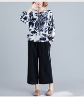 陶磁器柄とインクフラワー柄の2種類から選べる綿トップスと、リネン素材のワイドパンツのツーピースセットです♪