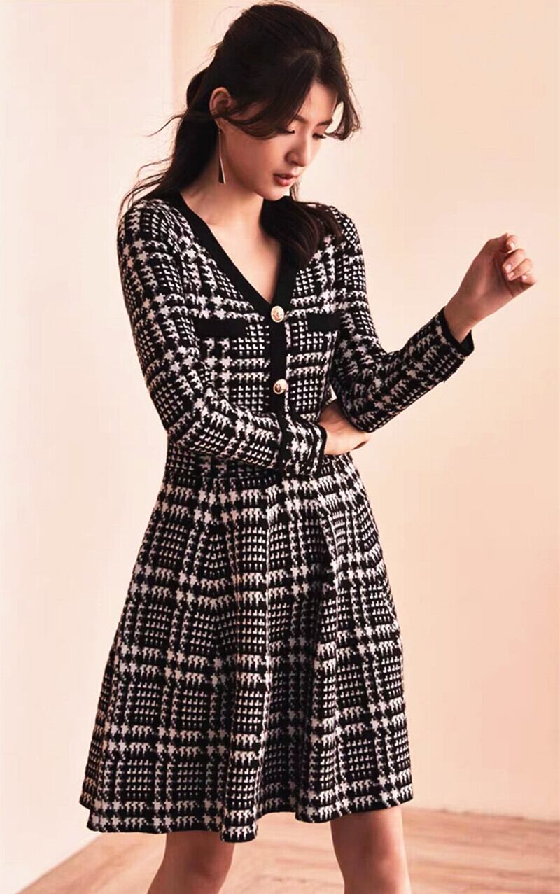 千鳥格子のニットワンピースです♪長袖でVネックのフェミニンなデザインです。