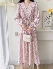 大人可愛い花柄ワンピースです。ミモレ丈で女性らしいシルエットを演出し、ボリューム袖が可愛らしさを引き立てます。Aラインのフレアデザインで、抜け感と存在感を両立させた一枚です。