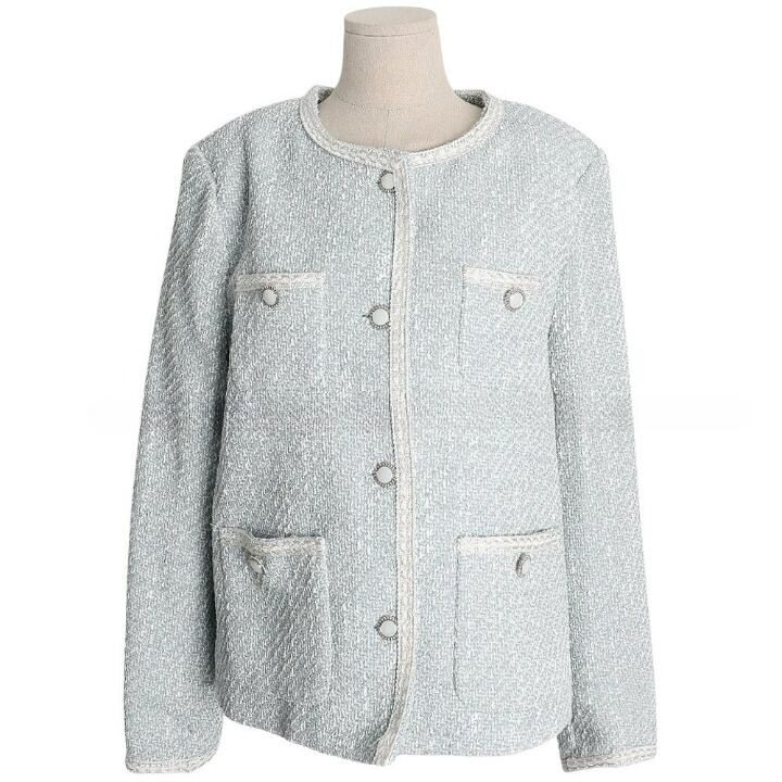 大人可愛いノーカラージャケット。シンプルでありながら、上品で女性らしい雰囲気が漂います。ツイード素材が高級感を演出し、品のある大人可愛いスタイルを叶えます。カジュアルにもきれいめにも活躍するアイテムで、どんなコーディネートにも合わせやすいです。