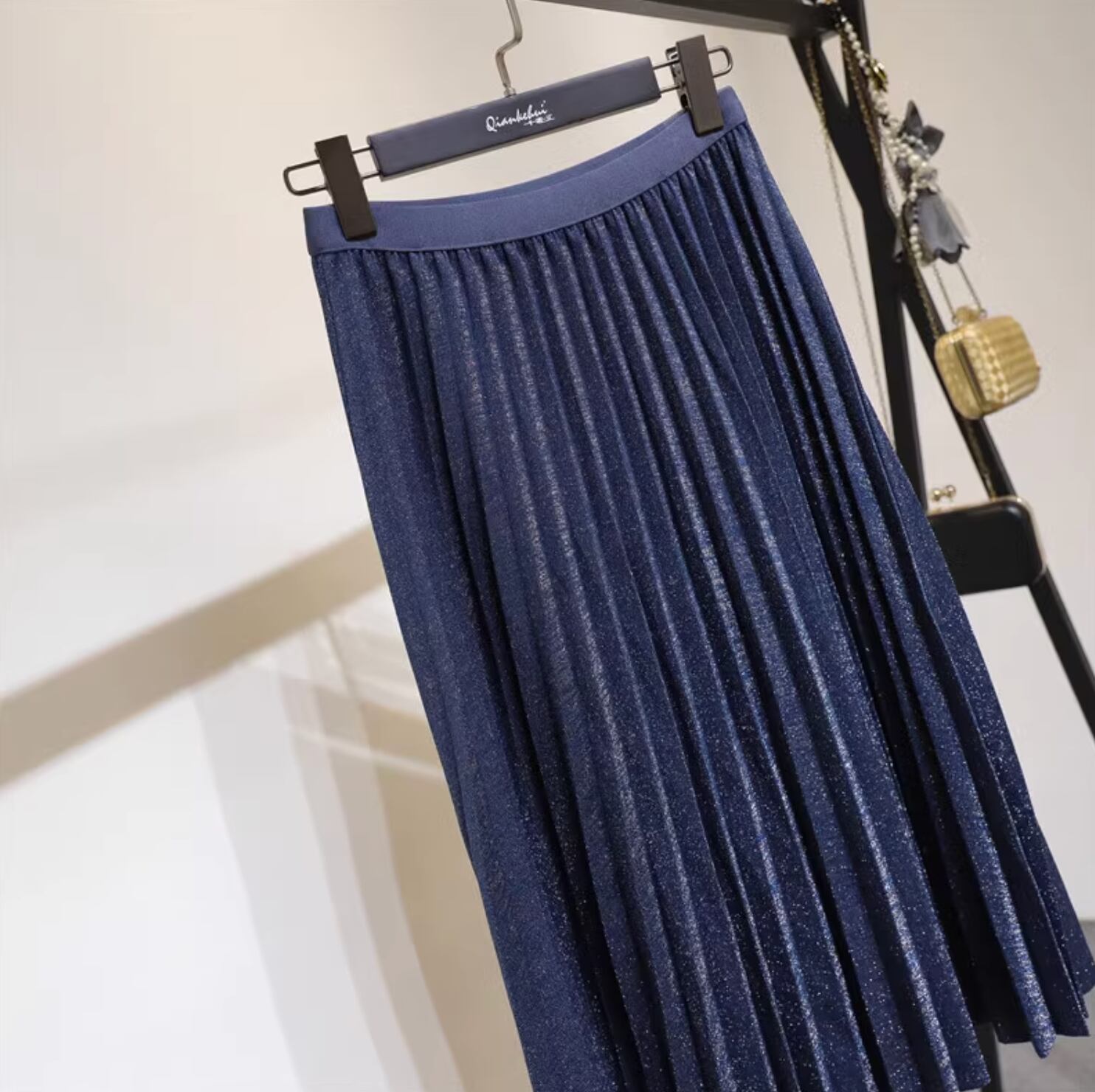 レディース スカート プリーツスカート ミディアム丈 フレア Aライン プリーツ ハイウエスト ウエストゴム ラメ かわいい 大人可愛い きれいめ シンプル 上品 おしゃれ こなれ感 モード系 エレガント 都会的 ラグジュアリー クラシカル 春 夏 秋 冬 ロングシーズン シーズンレス オフィス ビジネス OL 通勤 学生 学校 通学 デート お出かけ 旅行 女子会 ホテル ショッピング 発表会 コンサート 体型カバー 美脚 ワンサイズ ブラック グレー ブルー