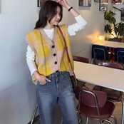 トップス ニット ベスト Vネック 前開き 伸縮性 フロントボタン かわいい 大人可愛い きれいめ シンプル カジュアル 上品 おしゃれ レトロ こなれ感 ラフ マニッシュ 主役級 存在感 トラッド プレッピー チェック クラシカル 万能 ベーシック 大人カジュアル オールシーズン レディース 合わせやすい 通勤 通学 お出かけ 公園 デイリー 着回し 重ね着 楽ちん 体型カバー 定番 王道 リラックス レイヤード フリーサイズ ゆったり ゆる ワンサイズ 緑 グリーン 黄色 イエロー