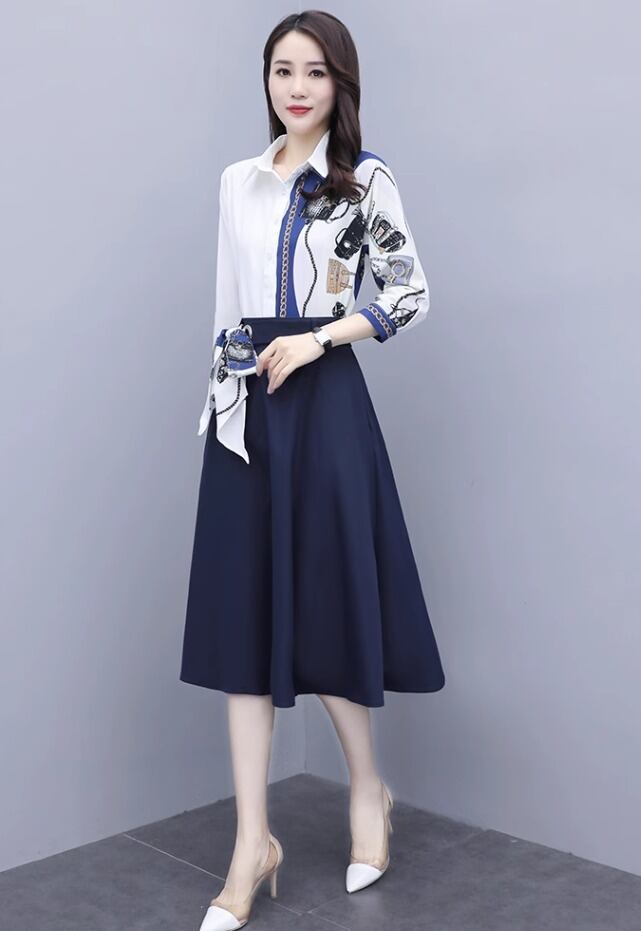 ツーピース セットアップ レディース スカート シャツ ブラウス フレアスカート 膝下 7分袖 襟付き アシンメトリー スカーフ Aライン リボン ウエストリボン ポケット コンサバ ボタン 切り替えデザイン 薄手 きれいめ カジュアル 上品 おしゃれ レトロ こなれ感 ラフ 個性的 エレガント 存在感 フォーマル かっちり 都会的 ラグジュアリー ハイエンド プリント 春 会議 オフィス ビジネス OL 通勤 パーティー レストラン ホテル 婚活 お呼ばれ 普段使い 着回し 清楚 ホワイト ネイビー