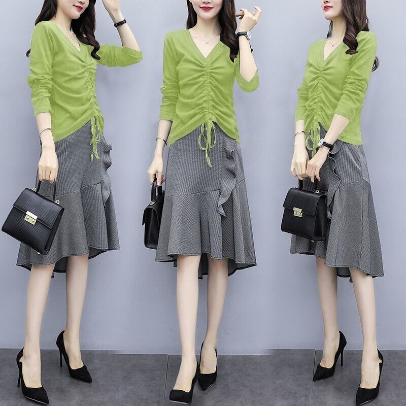 ツーピース セットアップ レディース スカート カットソー フレアスカート 膝丈 フィッシュテール 長袖 Vネック 襟なし スリム ドロスト コンサバ 切り替えデザイン バイカラー 配色 絞り 柔らか きれいめ シンプル カジュアル 上品 おしゃれ こなれ感 モダン 抜け感 キュート 都会的 ラグジュアリー ロマンティック ハイエンド フェミニン 大人女子 控えめ 無地 秋 会議 オフィス ビジネス OL 通勤 デート 合コン お呼ばれ 体型カバー 普段使い 着回し モテ 清楚 5XL ブラック グレー