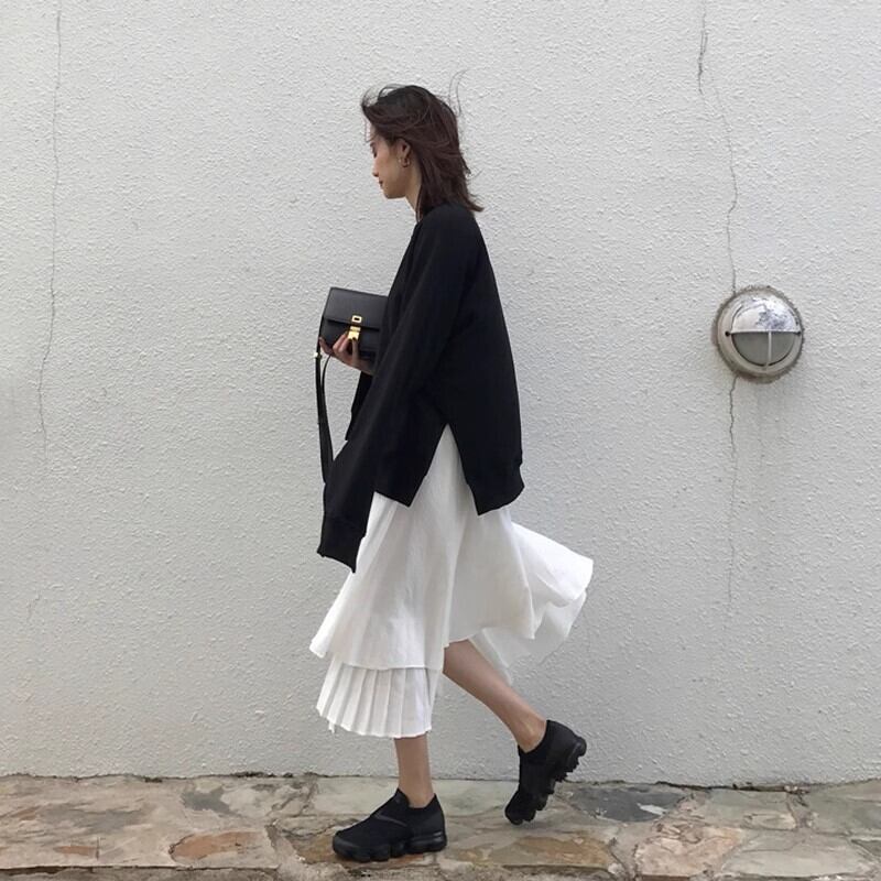 ツーピース セットアップ レディース スカート プルオーバー スウェット フレアスカート 不規則丈 長袖 ラウンドネック ワイド フレア Aライン オーバーサイズ 切り替えデザイン バイカラー 配色 ストレッチ 柔らか シンプル カジュアル おしゃれ かっこいい こなれ感 ラフ ルーズ 個性的 クール モード系 存在感 とろみ感 カレッジ風 学生風 ユニーク 無地 秋 お出かけ イベント 休日 ショッピング フェス 楽ちん 体型カバー 普段使い 着回し トレンド ゆったり ホワイト ブラック モノトーン