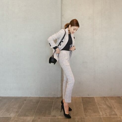 都会的でラグジュアリーなウィンドペンチェックが程よくカジュアルな印象をプラスしてくれるツーピーススーツ。ジャケットの大きめなボタンがアクセントに。絶妙な丈感のパンツはすっきりした印象を与え、ハイウェストだから脚長効果にも◎ ビジネスシーンは勿論のこと、パーティーなどの特別なシーンにもぴったり。優しいベージュカラーが女性らしさをアピール。