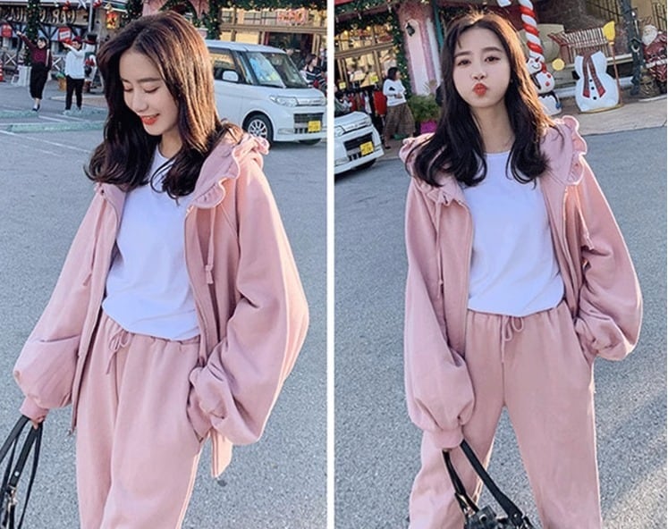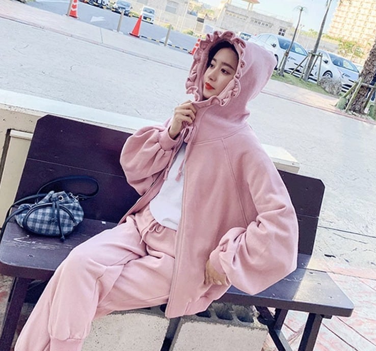 定番的なスウェット地のパーカー×ジョガーパンツのセットアップ。パーカーはフルジップタイプだから羽織りとしての着用も可能。フードにはフリルがデザインされていて、幼げでガーリーな印象をプラスしてくれます。ジョガーパンツはウェストゴム仕様でドロスト付きだから、お好みのフィット感に調節可能。ルームウェアとしても活躍し、幅広いシーンで着用頂けます。