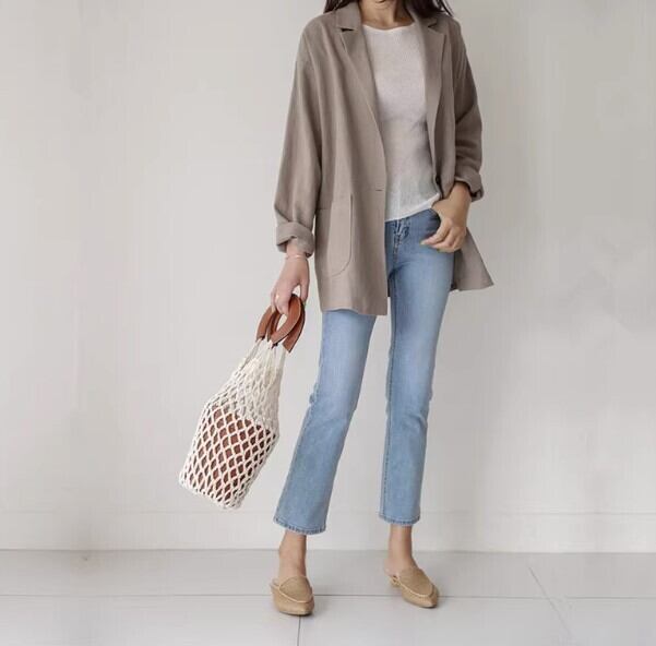 上品なレディースジャケット。麻素材を使用し、シンプルでありながら襟付きの角襟が上品さを際立たせます。かわいらしさと大人可愛さを兼ね備えたスタイルで、きれいめな装いにもカジュアルなコーディネートにもぴったりです。エレガントでモダンなデザインは、どんな場面でも主役級の存在感を放ちます。