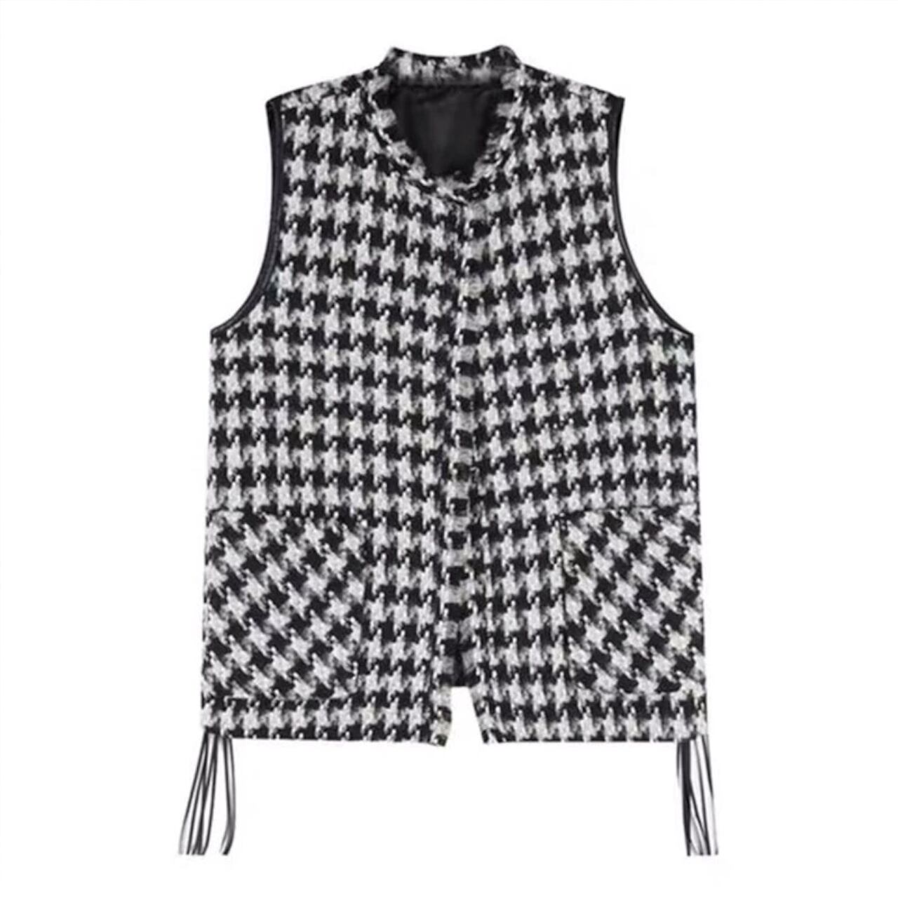 エレガントで個性的な千鳥格子柄が特徴のベストジレ。