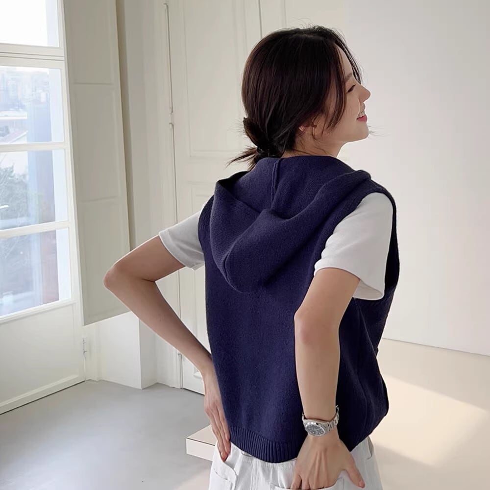 トップス ニット ベスト セミクロップド 袖なし ノースリーブ フード付き ポケット 前開き 伸縮性 フロントボタン 薄手 かわいい 大人可愛い シンプル カジュアル おしゃれ こなれ感 ラフ 抜け感 ナチュラル やわらかい 着心地 無地 万能 ベーシック 大人カジュアル オールシーズン レディース 合わせやすい デイリー 着回し 重ね着 楽ちん 防寒 体型カバー 脚長 定番 レイヤード フリーサイズ ゆったり ゆる ルーズフィット 灰色 グレー ベージュ 紺 ネイビー