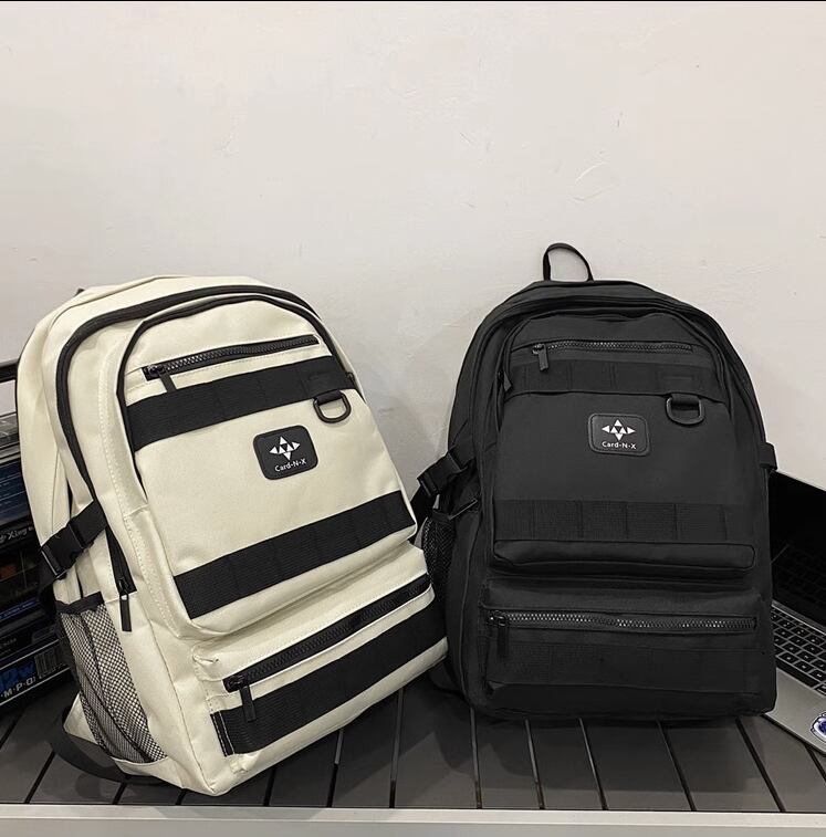 モノトーンカラーの通学リュックは、大容量で機能的なデイバッグです。男女兼用で、シンプルなデザインがお洒落な印象を与えます。多数のポケットやファスナー付きの収納スペースがあり、小物や必需品を整理しやすく、取り出しもスムーズです。