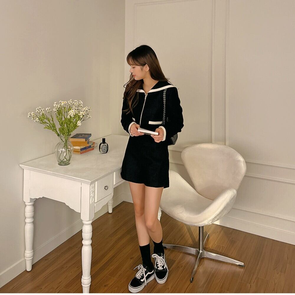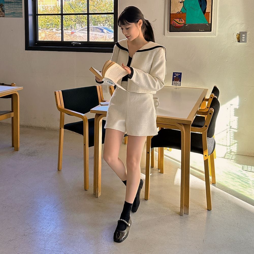 レディース セットアップ ジャケット ショートパンツ 長袖 セーラーカラー ストレート ファスナー ポケット ハイウエスト 配色 かわいい 大人可愛い きれいめ シンプル カジュアル おしゃれ ガーリー ラブリー キュート 都会的 カレッジ風 ナチュラル 無地 春 秋 シーズンレス 学生 学校 通学 部活 デート お出かけ パーティー イベント レストラン 女子会 ショッピング カフェ 双子 韓国 コーデ 普段使い 着回し モテ トレンド 流行 インスタ映え S M L XL ホワイト ブラック
